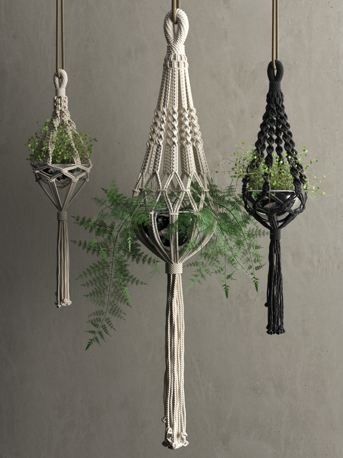 Eindelijk tijd gemaakt voor een nieuwe hobby? Dan is macramé touw geschikt om mee te beginnen, deze hobby is weer helemaal terug van weggeweest. De simpele basis bestaat uit een paar katoen draden en je kunt het zo makkelijk of moeilijk maken als je zelf wil. Zoals je hieronder kunt zien zijn de mogelijkheden eindeloos in het maken van macramé Plantenhangers - deze plantenhangers zijn gemaakt met behulp van Macramé touw.